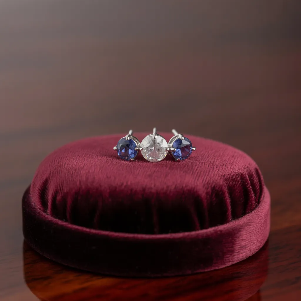 The gemstones often featured include emeralds, diamonds, and sapphires, signifying love and connection. The trio design commonly displays a middle stone flanked by two smaller ones, signifying the past, present, and future.